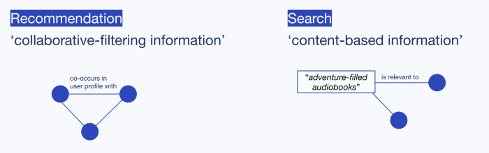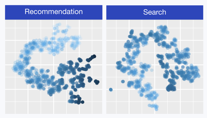 Comparison of recommendation and search signals. Items are represented by a blue dot, and connections in recommendation indicate that the item co-occurs in different user profiles, while for search it indicates that they are connected to a textual query.