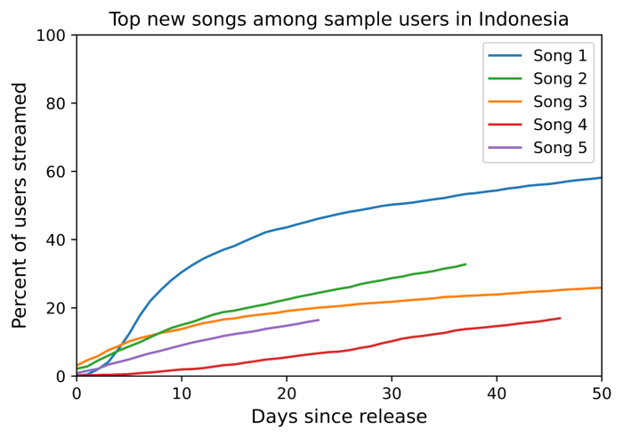 First, to figure out what music is trending, we look at how awareness of a song spreads within a community over time. We measure this by looking at what fraction of a community has listened to a song, day by day, since the song’s release. In the figure below, for an example group of users, we can see how awareness evolves over time for several newly-released songs. Shorter lines reflect songs released closer to the end of our two month sample period. Some songs gain popularity quickly, while others take longer but ultimately achieve greater popularity. Many users do not show awareness of popular songs until over a month after their release. Our recommendation system aims to help these users discover these songs earlier.